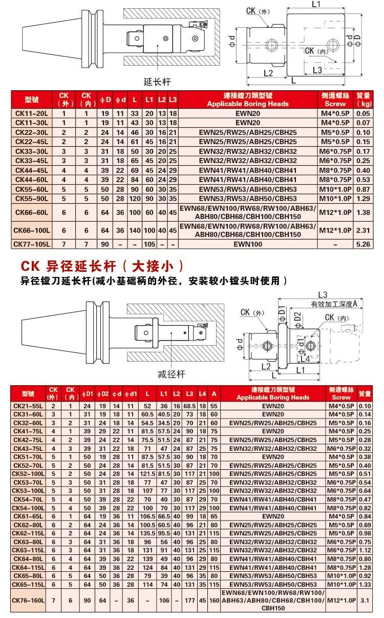 - Product Features: Same-diameter extension rods are suitable for extending same-diameter basic tool handles such as LBK, DCK, and CK series. Different-diameter extension rods are suitable for deep-hole machining, enabling the installation of boring heads with larger diameters on handles with smaller diameters, playing a role in shock resistance.