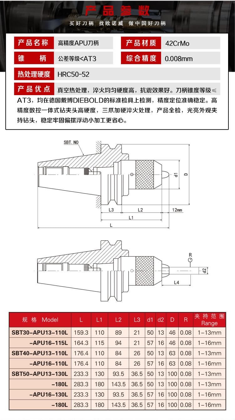 Product Advantages: Vacuum heat treatment, uniform quenching for high hardness, and good seismic resistance. The taper of the tool holder is ≤ AT3, tested using standard gauges from Germany’s Diebold, ensuring accurate and stable precision positioning. The high-precision CNC body-type drill chuck features high hardness, three-jaw hardened and quenched treatment, full inspection of the product, bright appearance, stable and firm clamping of the drill bit, and minimal runout, making machines more reliable.